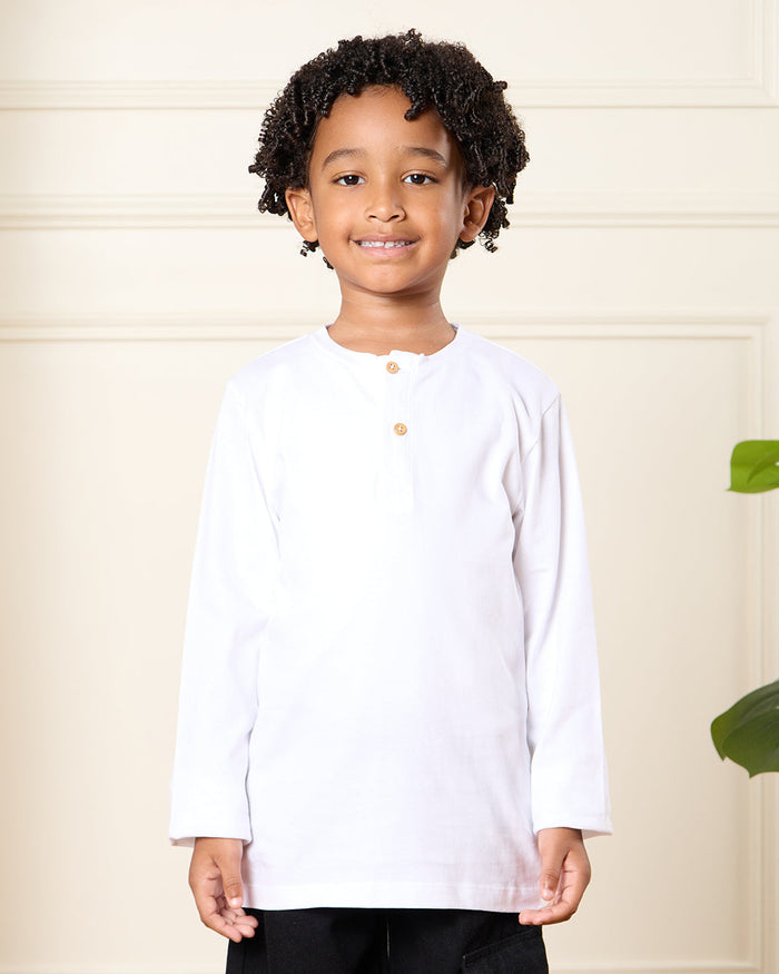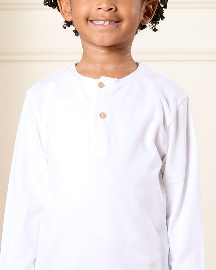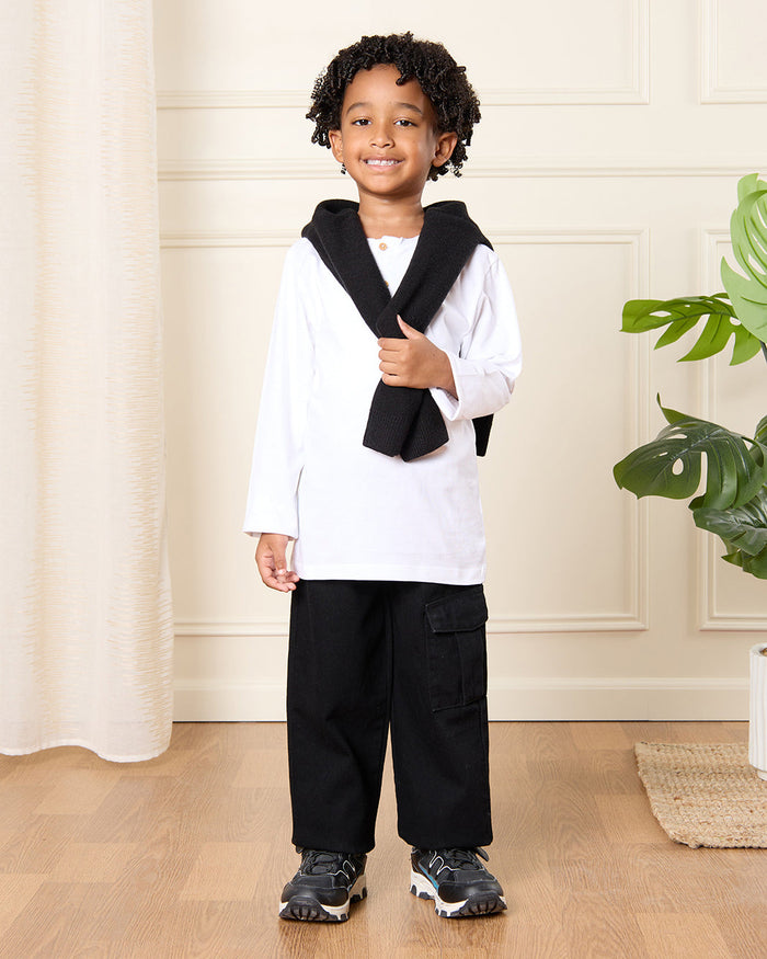 A stylish Henley shirt with a buttoned neckline, combining casual comfort with a smart touch, is ideal for both play and outings.